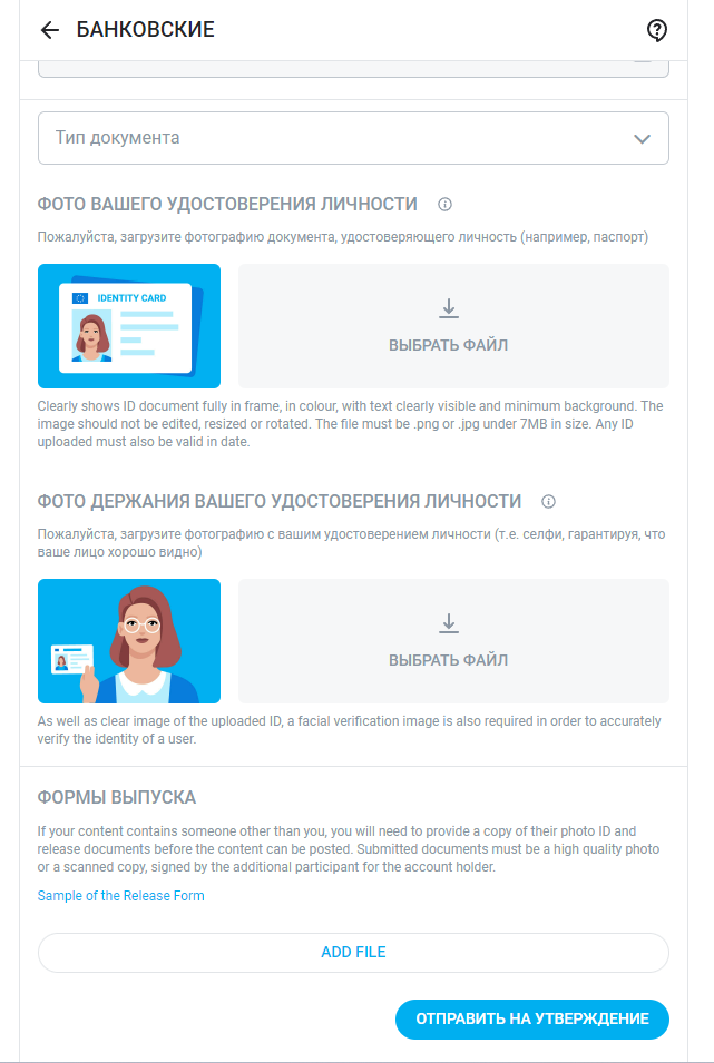 Чуть ниже вам необходимо загрузить фото вашего удостоверения личности, с помощью которого вы проходили верификацию, а также ваше селфи, где вы держите этот документ в руке.