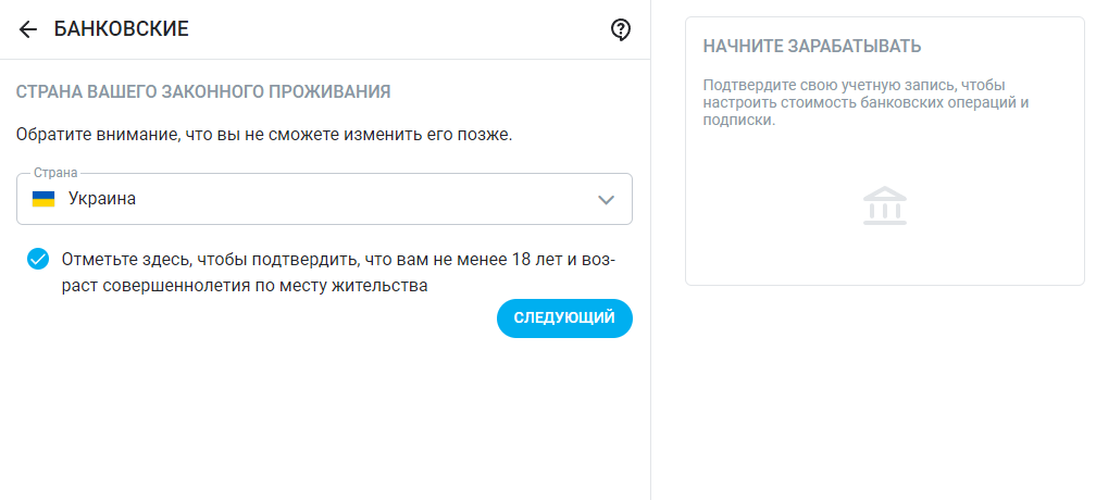 Когда нажмете "Сохранить изменения", вас перекинет на следующую страницу, где вам необходимо выбрать страну вашего законного проживания - то есть ту страну, на документы которой вы планируете регистрироваться. Тут будьте внимательны — эту информацию нельзя будет изменить в будущем, поэтому сразу выбирайте нужную. Подтверждайте свое совершеннолетие и кликайте на "Следующий".