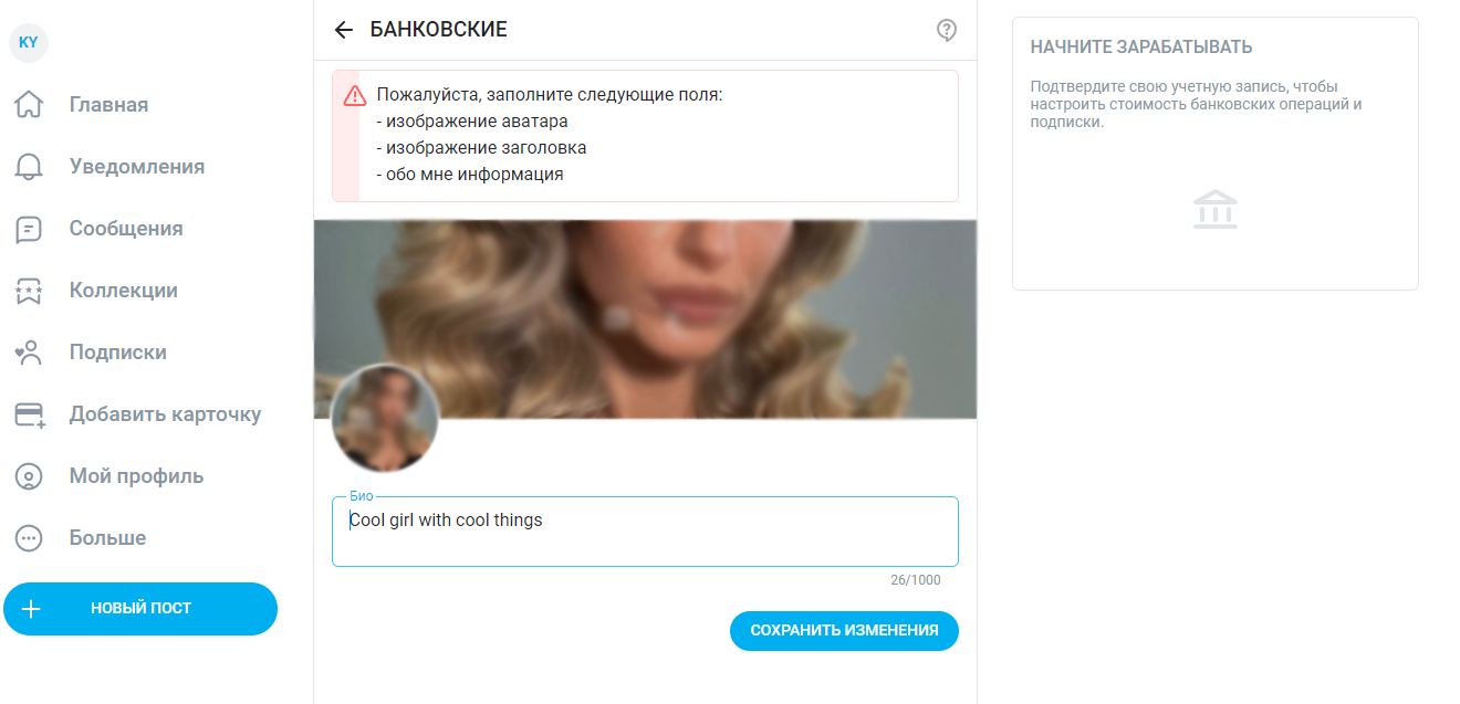 Далее загрузите свои фото на аватарку и шапку профиля. Важно, чтобы на фото был тот человек, на чьи документы оформлена страничка, иначе вы не сможете пройти верификацию. Также на аватарке и в шапке профиля не должно быть обнаженных фото — фотографии в белье или купальнике допускаются.